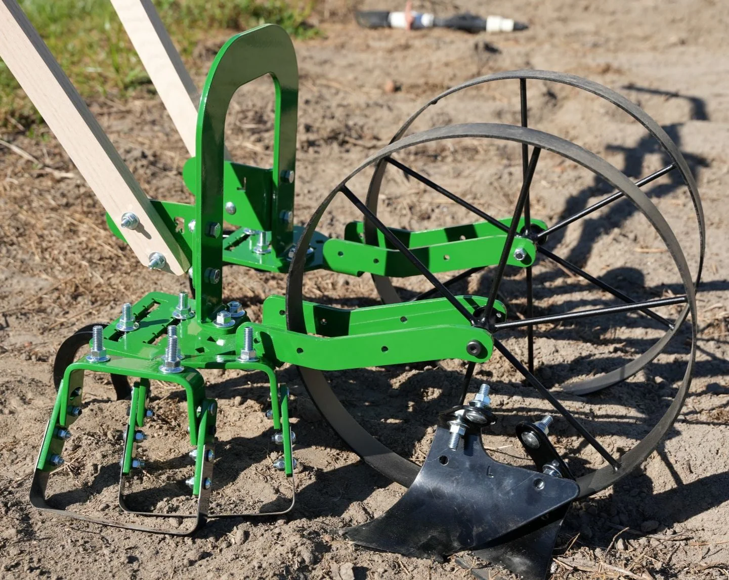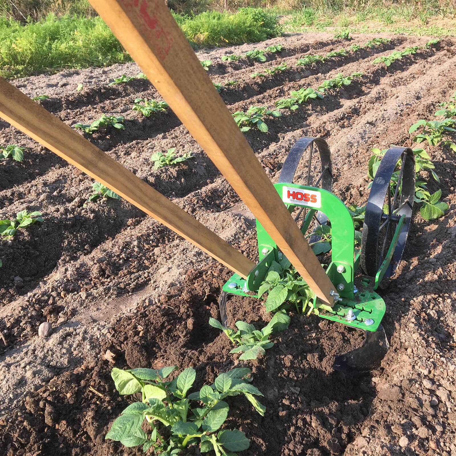 The High Arch Wheel Deal includes a complete set of attachments that will allow you to straddle a row to cultivate, plow and weed both sides of the row in one pass. The High Arch Wheel Hoe has a 15" clearance so that you can straddle taller plants. As well as, works great for hilling corn or potatoes, and also for close weeding of crops like lettuce and carrots. The double wheels provide excellent stability and center of gravity for easy pushing. Includes adjustable wheel spacing, so you can modify the distance between wheels based on the width of specific crops.