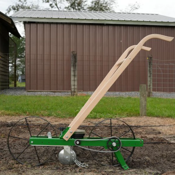 The Hoss Garden Seeder is constructed with Amish-crafted hardwood handles, 15″ steel wheels, and a powder-coated steel frame. The handles are adjustable to the users height. The steel frame ensures the unit is stable and easy to push in a straight line along the row.